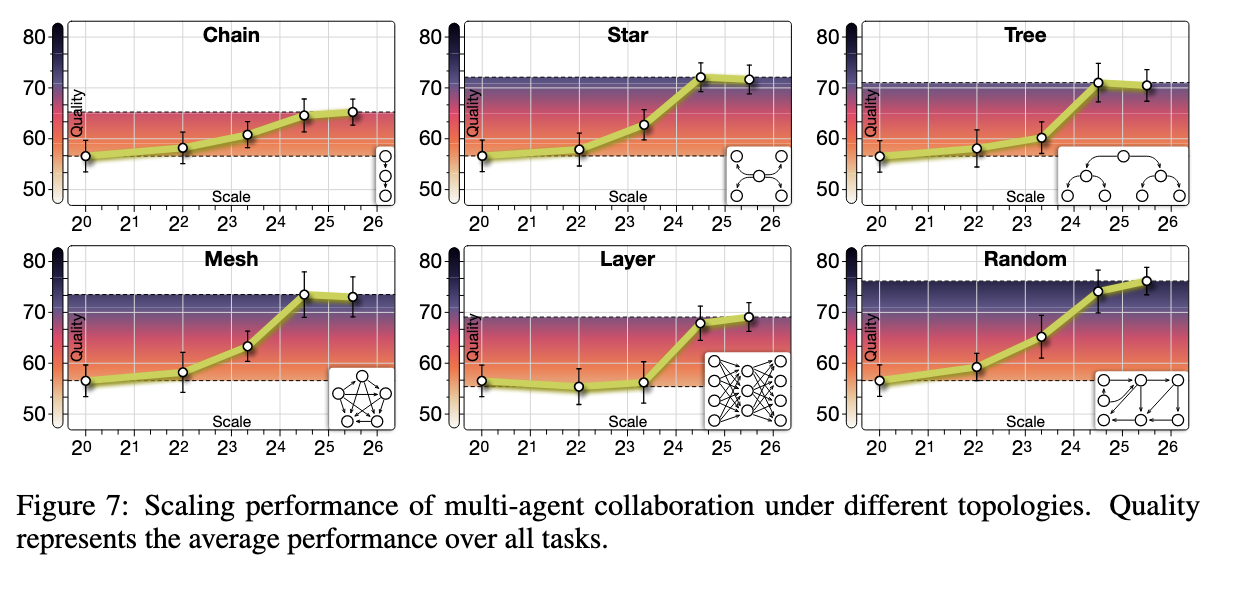 문제: 기존의 multi-agent 는 소규모에서는 효과적이지만, 구조 없는 확장은 coordination & context 비용으로 인해 성능이 붕괴된다. 접근: 효과적인 agent scaling 을 위해 DAG 기반 multi-agent collaboration network(MACNET) 을 설계했다. 관찰: agent 수 증가에 따라 성능은 logistic growth 형태로 증가했으며, 불규칙한 topology 가 규칙적인 구조보다 일관되게 우수했다. 한 줄 요약: 뉴런 수를 늘리면 성능이 좋아졌듯, 에이전트 수도 늘리면 성능이 좋아지지 않을까?